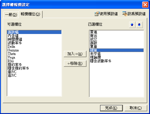 從可選欄位中選擇欄位按[加入]按鈕,或按[移除]按鈕刪除已選定的欄位。