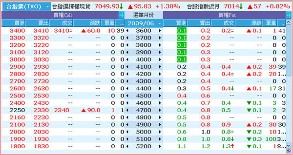 針對選擇權商品所提供的特殊看盤報價模式,將買權與賣權合併觀看。兩種報價方式:依月份報價與依履約價報價顯示 ,依月份報價可以選擇屢約價排序的方式是由小到大或是由大到小,若是選擇依履約價報價的話則可以選擇顯示方式是報價欄位或是合約月份欄位: