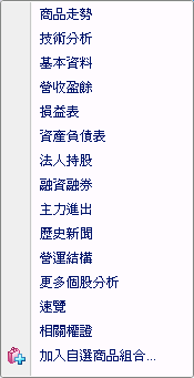 - 在股票名稱上點選滑鼠右鍵,可快速切換至該商品的商品走勢、技術分析、加入到自選組合,或是相關個股深入分析頁面。