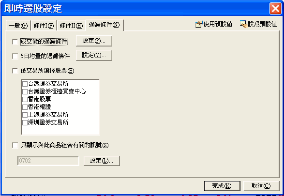 - 過濾條件:可再依成交價、五日均量、交易所,以及商品組合來縮小搜尋範圍。