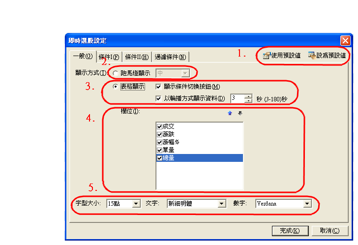 - 顯示切換按鈕︰在下方出現頁籤,以方便切換不同的選股條件。