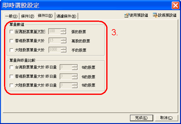 - 完整的條件項目,請參見附錄的[即時選股]單元。