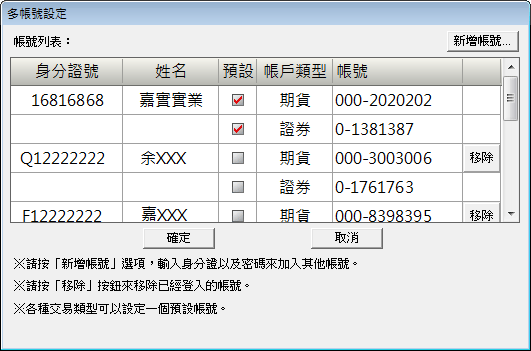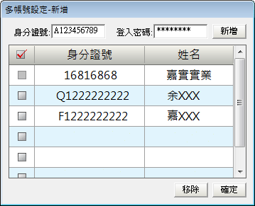 )按鈕,系統會彈出多帳號新增視窗,輸入正確的〔身分證號〕