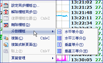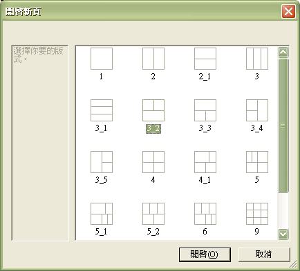 - 「分割欄框」提供將畫面再作切割的設計用。在要進行分割的欄框中,用滑鼠點一下使該欄框成為作用欄位,此時該欄框會以紅色框線框住,接著利用「水平分割、水平三分、垂直等分、垂直三分」以及「刪除欄框」的功能來設計版面。重覆此動作,即可切割畫面到所需的版面式樣。