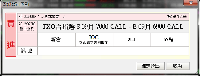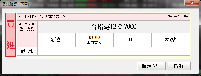 )按鈕,會彈出「委託確認」下單對話盒如下圖,按下〔確定送出〕鈕,即可送出
