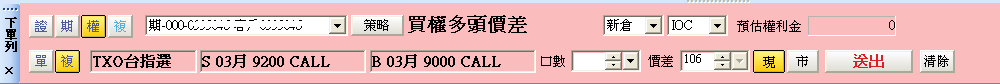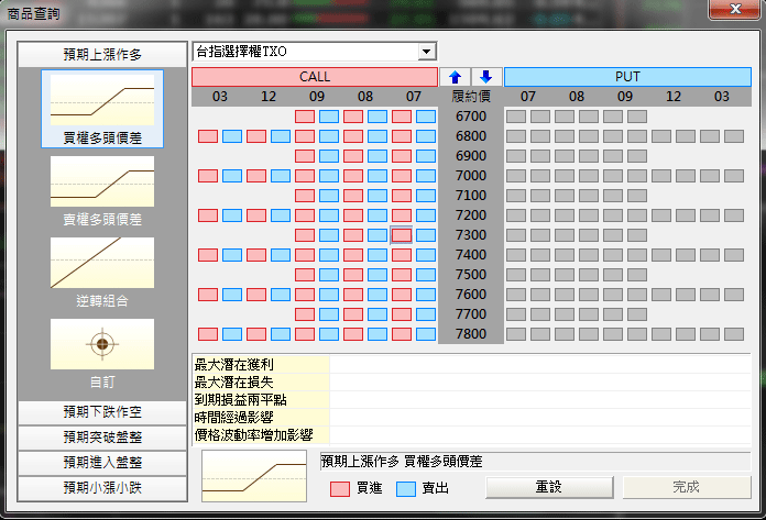 選擇欲交易的選擇權商品及策略組合,設定好以後按〔完成〕鈕,系統將將把這些資料送到下單列的商品欄位內。