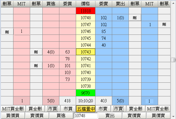 •〔價格〕欄:顯示所選擇商品的報價,價格範圍為當日的漲停至跌停價,可以利用右方的捲動軸來上下移動價格區域。