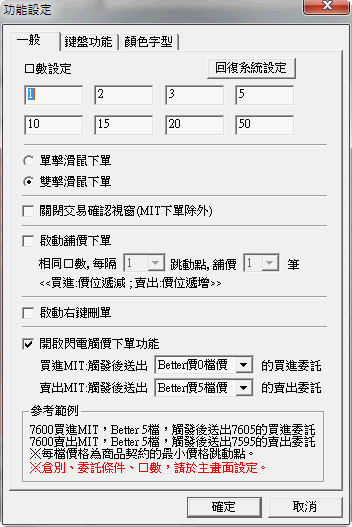 〔口數按鈕〕:提供使用者快速點選所要交易的口數,點選按鈕後系統會把所點選之數量帶入口數欄內 ,口數的快速按鈕可點選