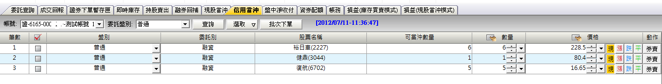 、「融資選取」、「融券選取」、「全部清除」可將工作表內委託資料的核取方塊選取委託。