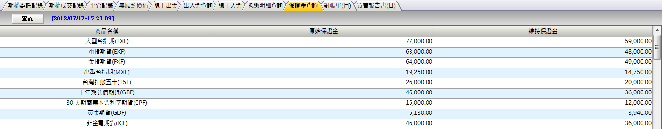 由交易頁面"群組按鈕"的「期貨選擇權」點選「期權帳務」\「保證金查詢」。