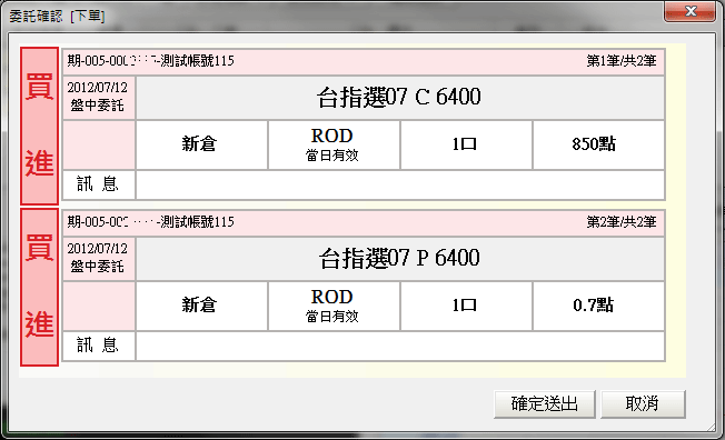 )按鈕, 會彈出「委託確認」下單對話盒,按下〔確定送出〕鈕,即可送出委託;若按下