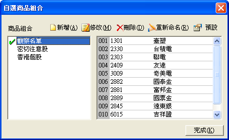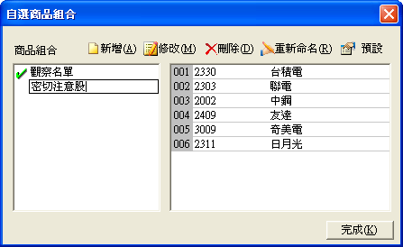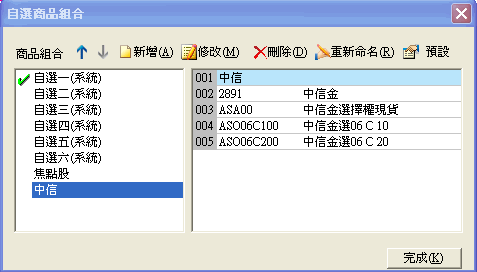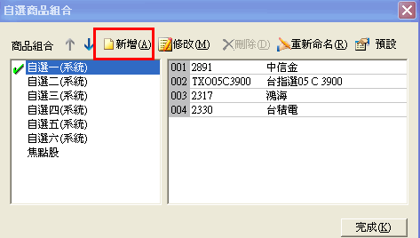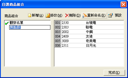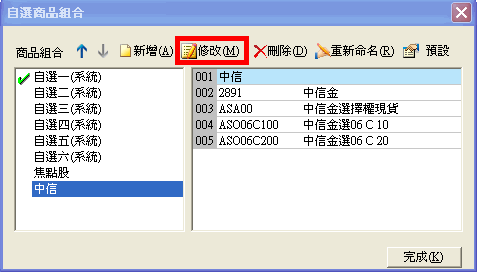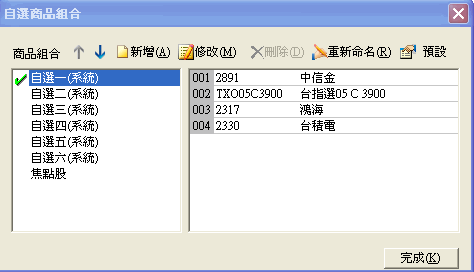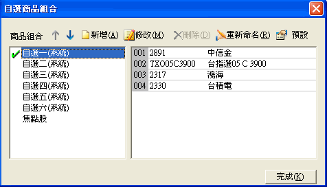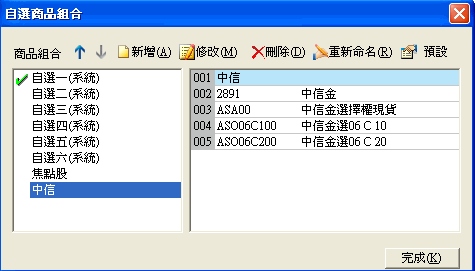 | 進入自選商品組合對話盒後,點選要修改名稱的商品組合,然後點下[重新命名]按鈕,該組合名稱即會出現黑框,直接輸入新的名字,然後按鍵盤的[Enter]即完成修改名稱動作。 |