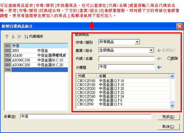 - 挑選商品,並設定組合名稱。可從查詢商品區依[市場/類別]來挑選商品,也可直接在[代碼/名稱]處,直接輸入商品代碼或名稱。利用[市場/類別]來切換時,下方的[產業/組合]的項目會跟著變動,同時最下方的明細也會跟著調整,使用者僅需在要加入的名稱上用滑鼠點兩下即可加入。