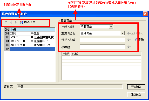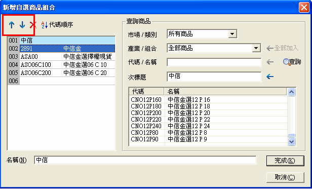 )、[下移]按鈕( )、[按代碼排序]按鈕( )來調整商品上移、下移或是依股號排序的順序,同時可用[刪除]按鈕( )來刪除商品。
