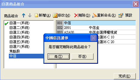 - 進入自選商品組合對話盒後,點選要刪除的商品組合名稱,然後點下[刪除]按鈕,系統即會跳出對話盒,要求確認刪除的動作。