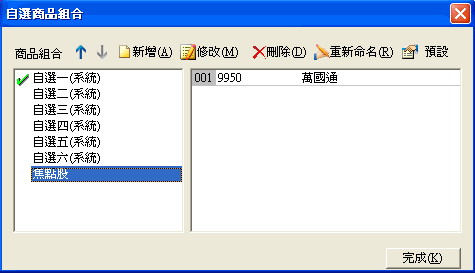| 點選主功能中[功能]中的[自選商品組合],接著會跳出對話盒,即可開始進行編修動作。 |