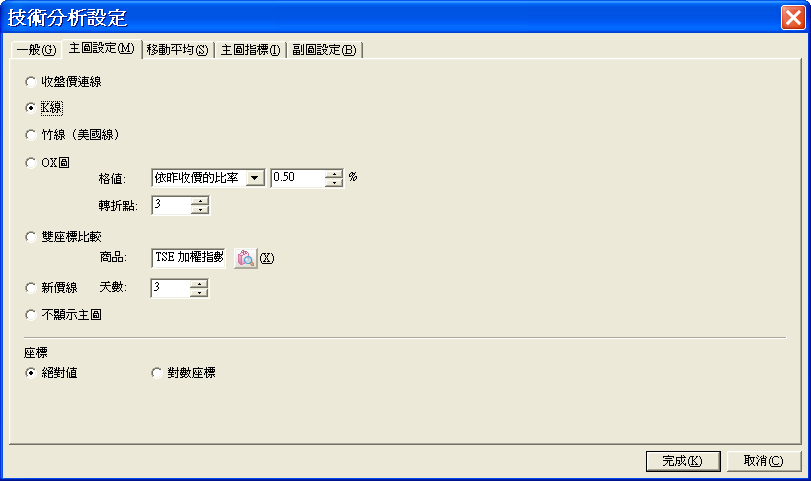 接著會跳出對話盒,相關設定分別列示在[一般]、[主圖設定]、[主圖指標]、[副圖設定]的Tab內,以供修改。依序說明如下。