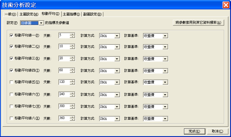 移動平均:設定繪製於不同資料頻率主圖上的指標參數。(以