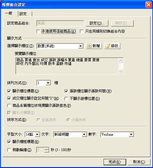 顯示欄位標題,若勾選,則會列示欄位表頭;漲跌欄位顯示漲跌符號,若勾選,在漲跌欄位數值前方會依上漲或下跌而顯示