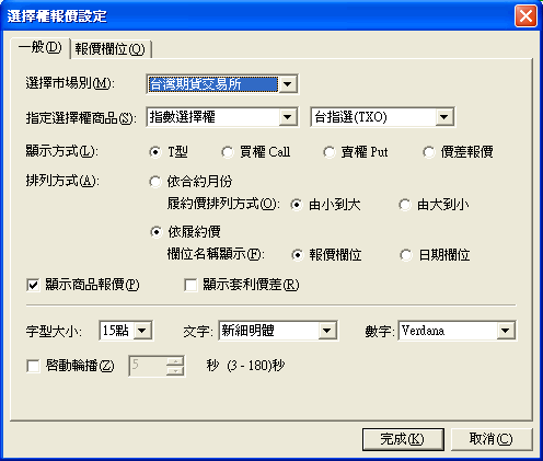 啟動輪播:若有勾選此項,表示[啟動輪播]功能,並設定輪播的速度,選擇權報價頁面會依序由上往下輪動。