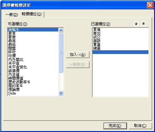 從可選欄位中選擇欄位按[加入]按鈕,或按[移除]按鈕刪除已選定的欄位。