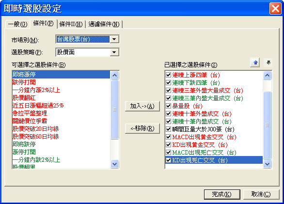 - 選股策略︰根據不同的市場提供不同的選股策略,項目有:股價面、量能面、技術指標面、短線法寶等等。挑選大項目後,下方的可選條件會隨之改變;從"可選擇之選股條件"選定項目後,快擊滑鼠左鍵兩下或按下[加入]按鈕將項目加進"已選擇之選股條件"框內。若要暫時停止某個選股條件,僅需點選該條件名稱,取消名稱前方的勾勾即可,也就是方框由