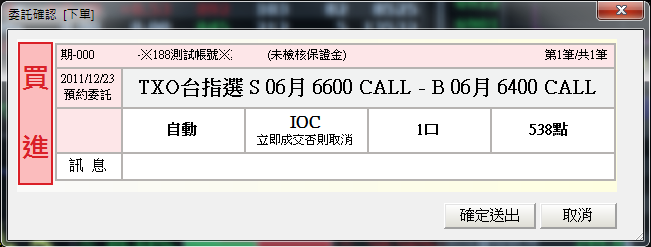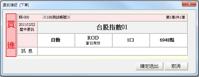 )按鈕,會彈出「委託確認」下單對話盒如下圖,按下〔確定送出〕鈕,即可送出