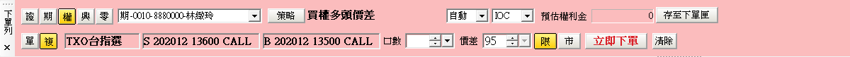 選擇欲交易的選擇權商品及策略組合,設定好以後按〔完成〕鈕,系統將將把這些資料送到下單列的商品欄位內。