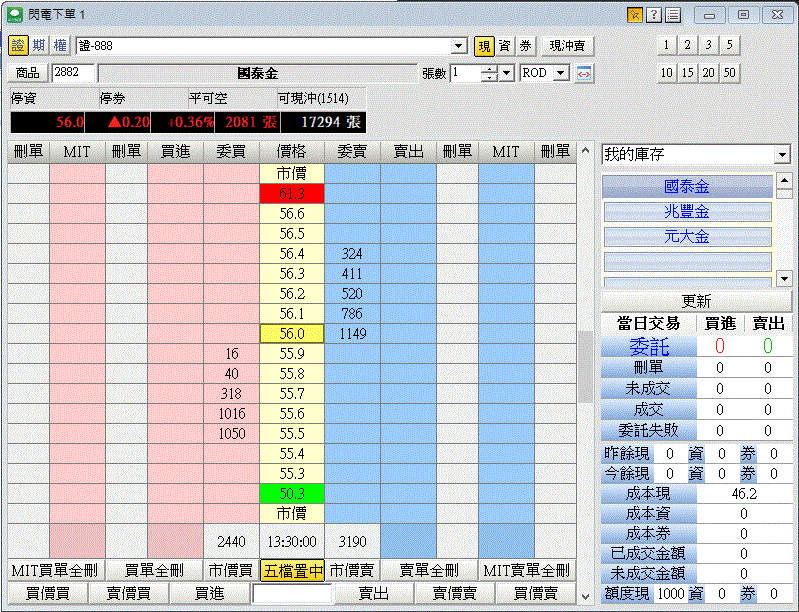 按下( )按鈕,可更新左方下單區域( )及下方的當日委託/成交資訊。