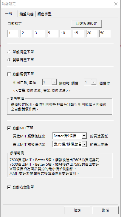 〔快速選擇數量〕按鈕:提供使用者快速點選所要交易的 數量,點選按鈕後系統會把所點選之數量帶入數量欄內 ,