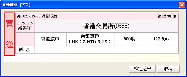 委託;若按下〔取消〕鈕,則取消此筆委託單的送出動作。 |