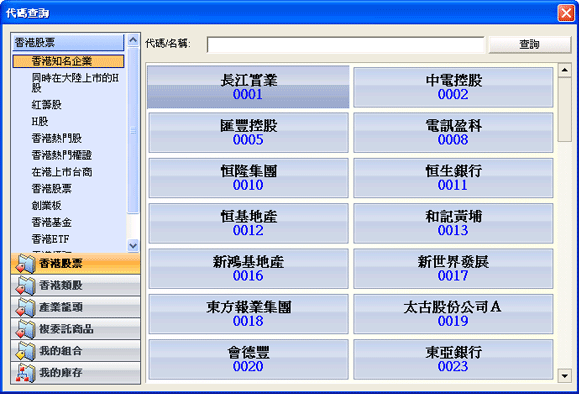 系統會依所選擇的市場別,彈出港股〔代碼查詢〕或美股〔代碼查詢〕對話盒。 |
