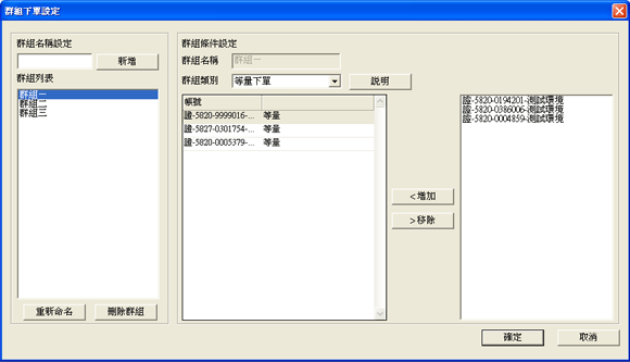•「等量下單」:群組內所有帳號,以「下單列所輸入的數量」,進行同ㄧ數量的下單。 |