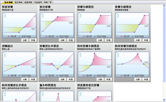 :〔買進買權〕、〔賣出賣權〕、〔買權多頭價差〕、〔賣權多頭價差〕、〔逆轉組合〕、 |