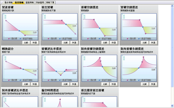 〔看空策略〕提供11種交易方式 :〔買進賣權〕、〔賣出買權〕、〔賣權空頭價差〕、〔買權空頭價差〕、〔轉換組合〕