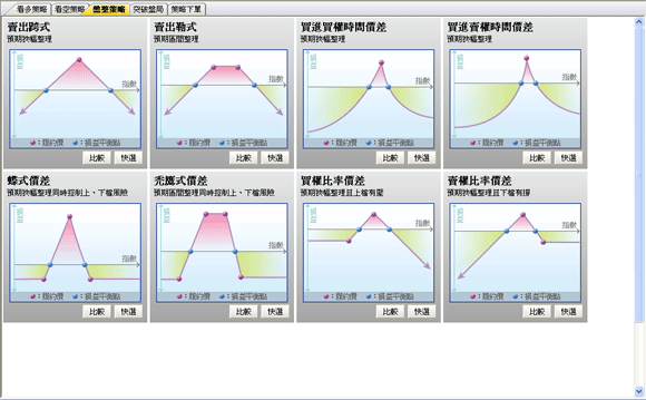 〔盤整策略〕提供8種交易方式 :〔賣出跨式〕、〔賣出勒式〕、〔買進買權時間價差〕、〔買進賣權時間價差〕、 |