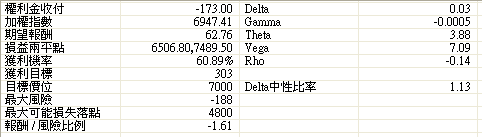 假設在加權指數6512.63點,“標的指數歷史波動率”(標準差)為0.1489的情況下,買進1口6500 Call在144點、賣出1口6400 call在207點(剩餘到期天數30天),指數到期上漲5個標準差時為8058.44點,下跌5個標準差時為5242.94點,計算指數每個點發生的機率,將之乘以策略部位在指數每個點的損益再加總。