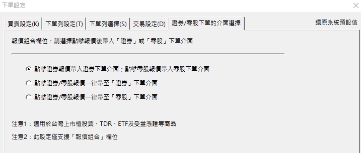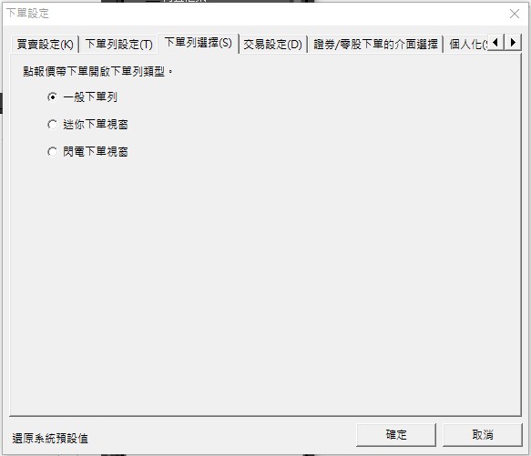 七種下單設定:〔買賣設定〕、〔下單列設定〕、〔下單列選擇〕、〔交易設定〕、〔證券/零股下單的介面設定〕、〔個人化〕、〔憑證設定〕。 |