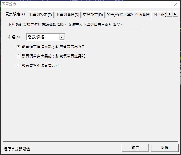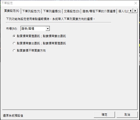 •〔買賣設定〕:可依市場別,設定點選報價的買、賣價時,系統帶至下單列的買賣方向。 |