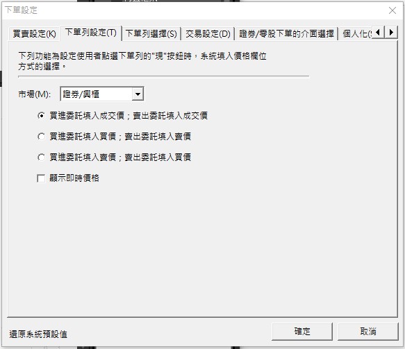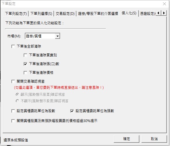 可針對不同市場別選擇下單後是否清除下單資訊。也可選擇下單時是否顯示交易確認視窗。設定興櫃委託單位為張數或股數。可設定是否興櫃30%提示。