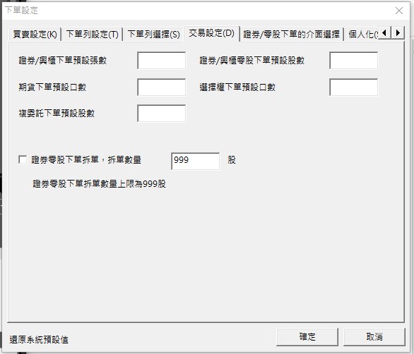 可以預設各市場別的下單張/口數,也可選擇在證券零股下單時拆單送出。 |