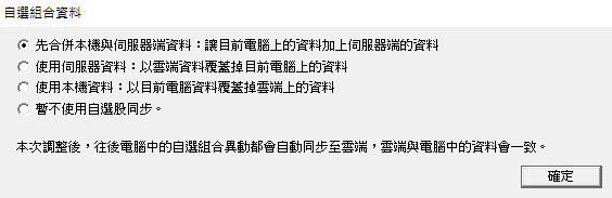 先合併本機與伺服器端資料:將目前這台電腦上的自選股與雲端伺服器上的自選股合併後,上傳雲端伺服器記錄留存。