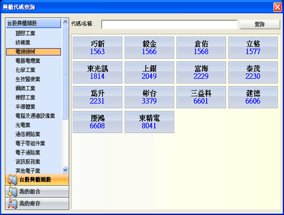 〕按鈕,可以搜尋出所輸入的「股票名稱」及「股票代碼」。