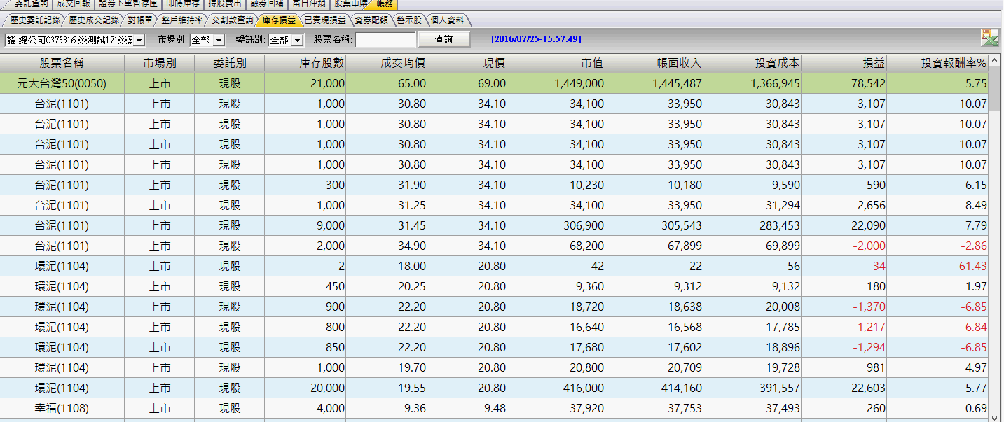 由交易頁面"群組按鈕"的「證券」點選「帳務」/「庫存損益」。