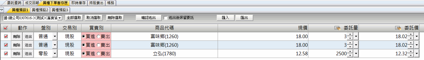已勾選( )的委託資料在點擊( )按鈕後,會繼續保留在下方的工作表中,讓後續下單時方便繼續使用。 |