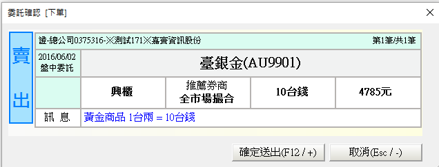 系統會彈出「此單筆委託確認」下單對話盒如下圖,按下〔確定送出〕鈕,即可送出委託;若按下〔取消〕鈕,則取消此筆委託單的送出動作。 |
