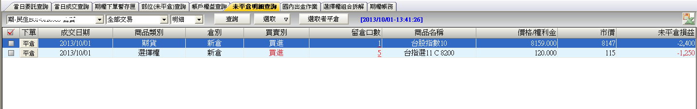 由下拉式選單選擇查詢「全部交易」、「期貨交易」、「選擇權交易」。