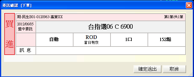 鈕,會彈出「委託確認」下單對話盒,按下〔確定送出〕鈕,即可送出委託;若按下〔取消〕鈕,則取消此筆委託單的送出動作。 |