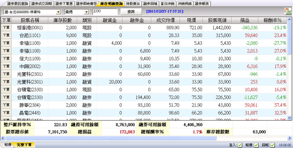 庫存明細資料;「匯總」為顯示依同一檔股票的庫存明細資料。 |