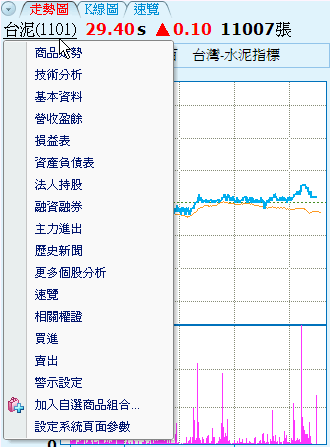 - 點選商品名稱,用滑鼠按右鍵,出現選單功能,可連結商品走勢、技術分析、深入分析功能頁,與將該商品加入自選商品組合,如下圖所示。